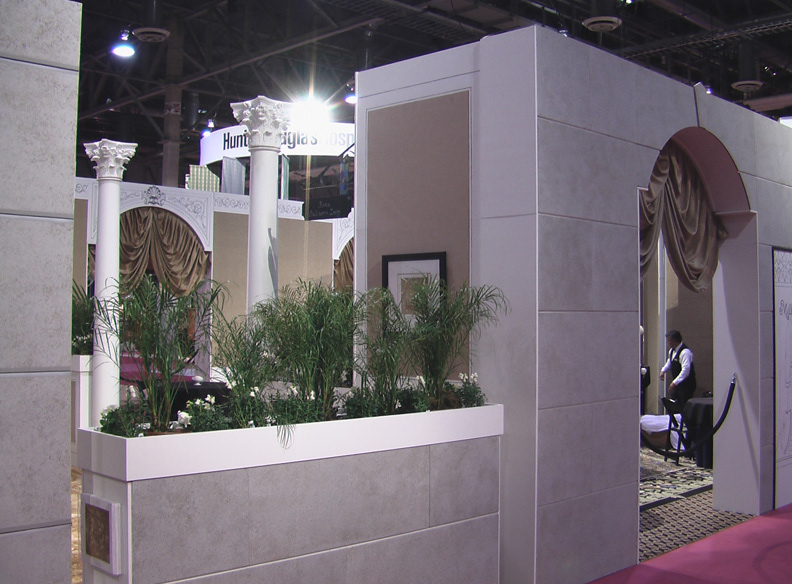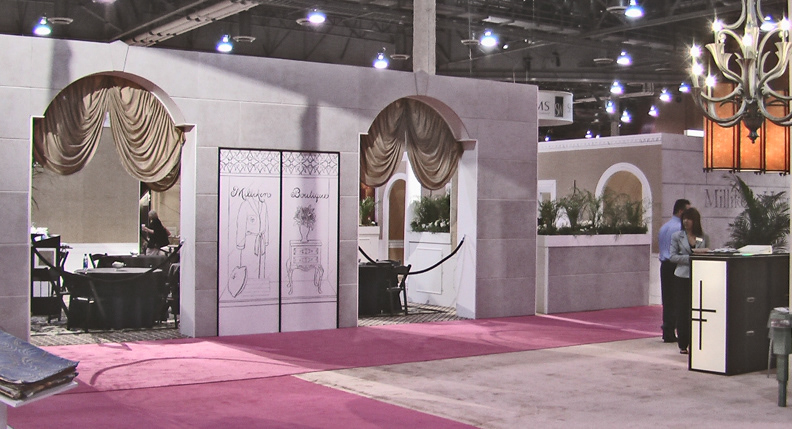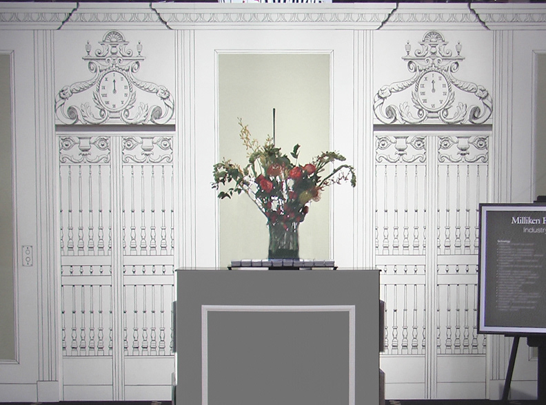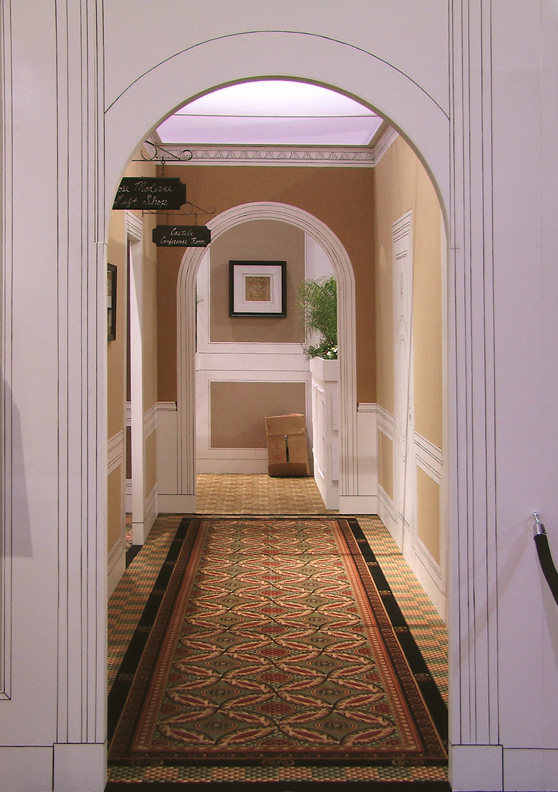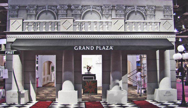 2004 Showcasing Milliken’s new “EVER” technology in a life-size forced perspective Italian street scene, leading to a piazza with a fountain. I Maddonari chalk painting mirroring the carpet pattern. All facades of the “building” and floor “were 300 dpi ink-injected carpet images creating the illusion of cobblestone, tile, and ivy creeping up the walls.